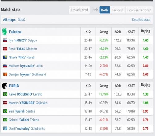 最后一局Falcons双狙开局,随后五人抱团A小集合!双人跳CT解决掉了molodoy大狙!NiKo再度双杀破局!残局Furia的2V3回防,TeSeS+NiKo瞬间0换2杀死比赛!Falcons以13-11拿下对手选图!